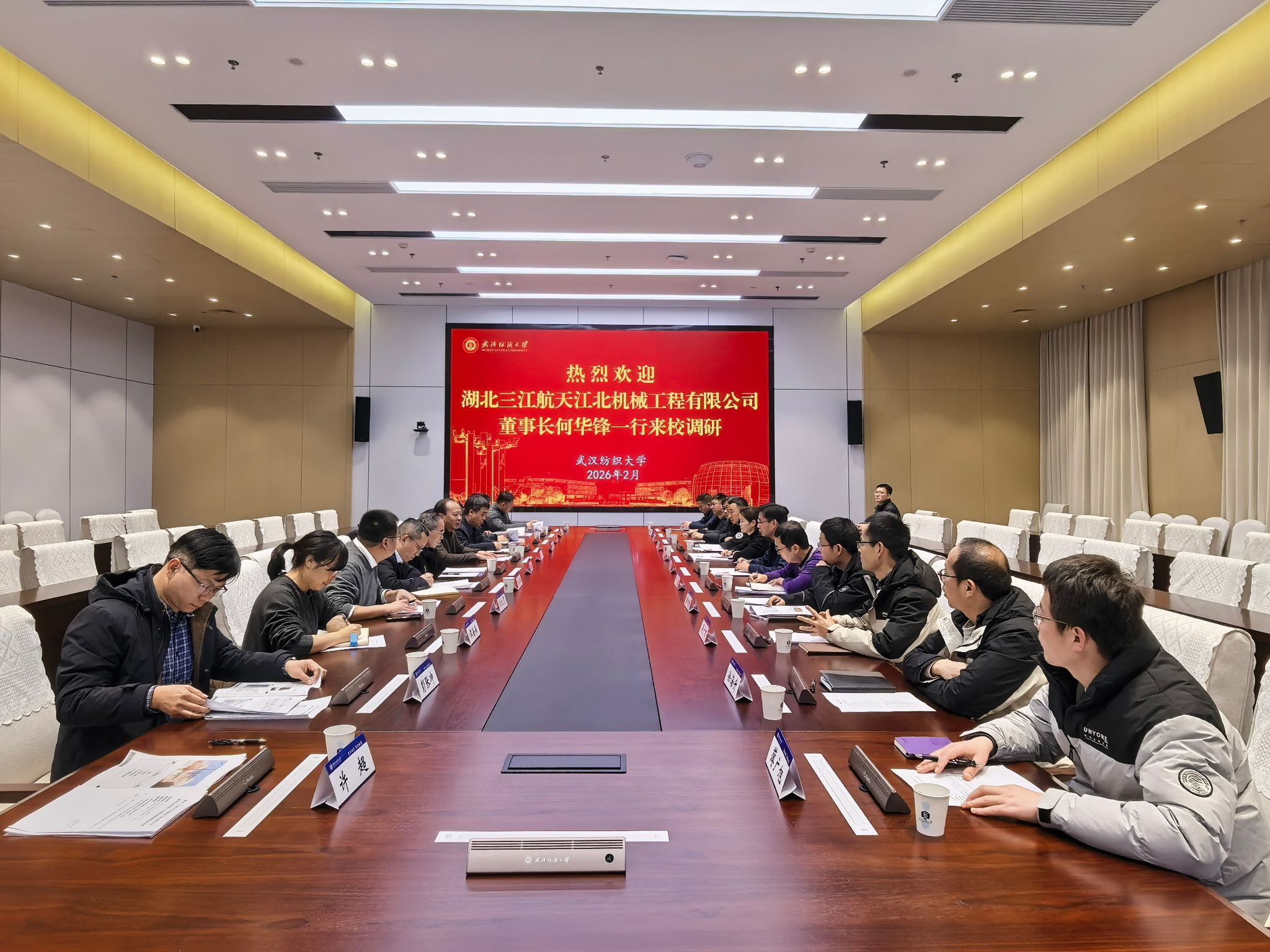 2月2日下午,湖北三江航天江北机械工程有限公司董事长何华锋率公司管理及技术专家团队一行莅临我校,围绕深化校企合作、推动技术协同创新等议题开展专题调研与座谈交流。校党委书记徐卫林院士出席会议并致欢迎辞,副校长冯军主持会议,科发院、材料学院、纺织学院、全国重点实验室等相关单位负责人及专家代表参加座谈会。